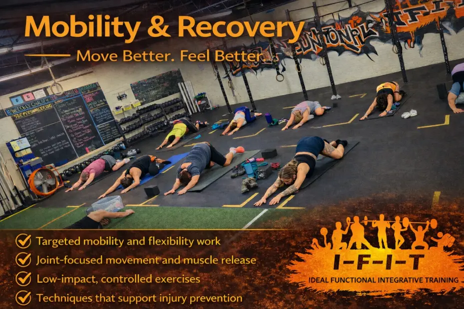 Mobility & Recovery is a guided class designed to improve joint mobility, flexibility, and muscle function so your body feels looser, stronger, and ready for both workouts and everyday life.